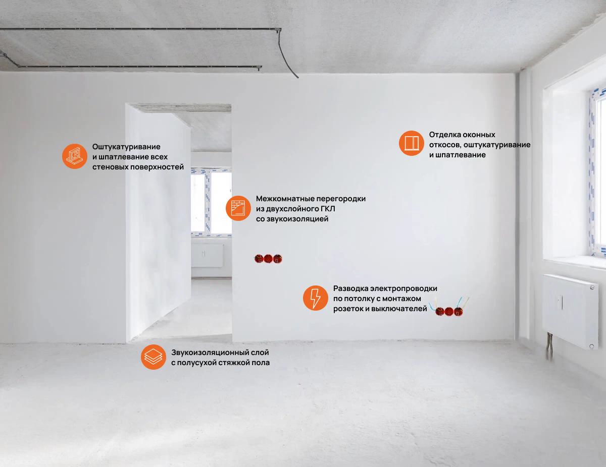 Квартиры доступны и в предчистовой отделке white box. Уже выполнены все грязные работы и можно будет приступить к самому приятному — финишной отделке.